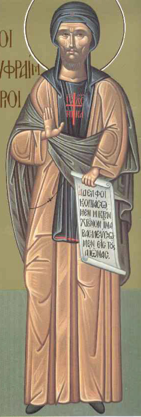 Ο Οσιος Εφραίμ (306-373 μ.Χ.) ανήκει στη χρυσή εποχή του 4ου μ.Χ. αιώνα. Γεννήθηκε στην πόλη Νισιβη της Συρίας, άσημος, πτωχός, αλλά «συγγενής μαρτύρων», όπως γράφει ο ίδιος, έχει δάσκαλο τον Επίσκοπο της πόλεως Ιάκωβο, τον «επίλεκτο σύμμαχο» στούς αγώνες του Μεγάλου Αθανασίου (18 Ιανουαρίου).