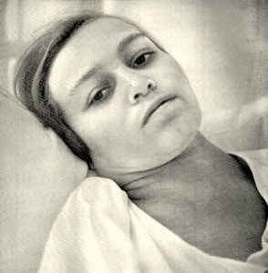 Η αδελφή Άγνή, ξαπλωμένη στο χιονάτο της κρεββάτι μας κύτταξε ειρηνικά και φιλικά με τα μεγάλα της γαλάζια μάτια. Τα μαλλιά της ήταν, όπως πάντα, σκεπασμένα από τη λευκή της σκούφια. Το πρόσωπό της έμοιαζε με την όψι μιας πονεμένης μαντόνας, άπειρα τρυφερό και συγκινητικό μέσα στην παιδιάστικη ευσέβεια της.