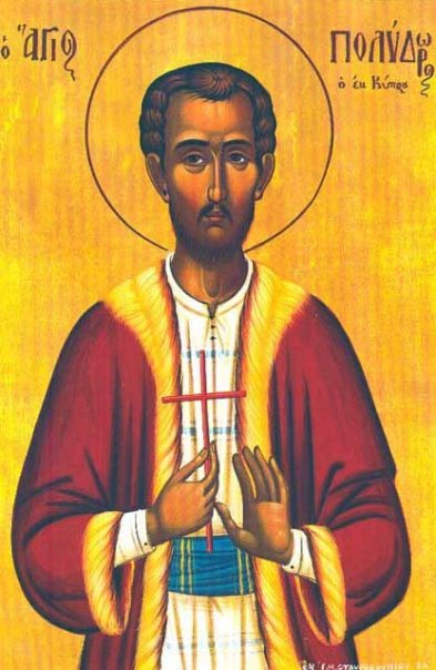 Της ημετέρας γενεάς το ακροθίνιον, δεύτε συμφώνως οι πιστοί ανευφημήσωμεν, τον πανένδοξον Πολύδωρον τον εκ Κύπρου, εν Εφέσω δε τη Νέα εναθλήσαντα, και τους