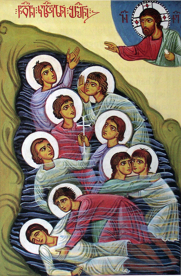 Στη συνέχεια, με επικεφαλής τον ηγεμόνα, πήγαν στην πηγή του ποταμού, όπου λίγο καιρό πριν είχαν βαπτιστεί οι μικροί άγιοι. Εκεί έσκαψαν έναν βαθύ λάκκο κι έριξαν μέσα τα παιδιά. Ήταν όλα από εφτά έως εννέα χρονών.