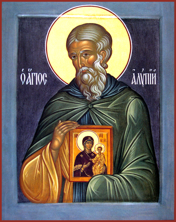 Μιμητής του ιερού ευαγγελιστή και πρώτου εικονογράφου Λουκά αναδείχθηκε ο όσιος πατέρας μας Αλύπιος ο σπηλαιώτης. Αυτός ο μακάριος θαυμαστά εικονογραφούσε τις μορφές των αγίων, ενώ ταυτόχρονα και την ψυχή του στόλιζε μ’ όλες τις αρετές. Ετσι ο Θεός τον αξίωσε να γίνη γιατρός θαυματουργός ψυχών και σωμάτων.