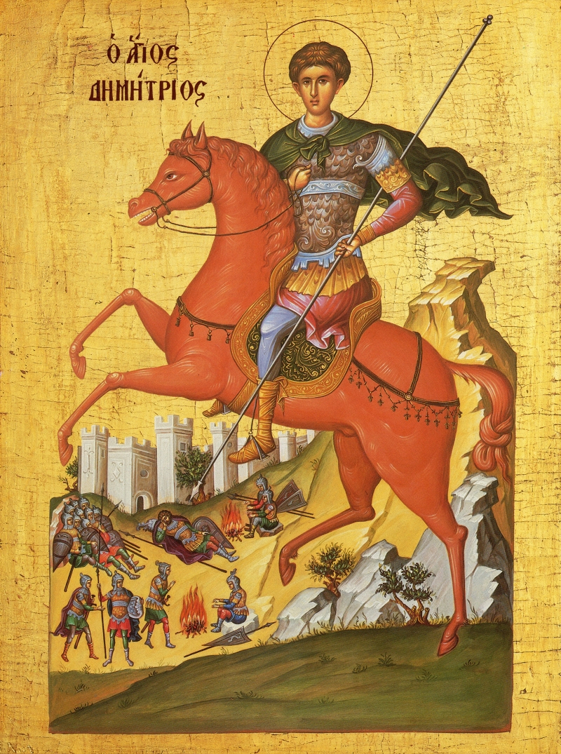 Σήμερα η εκκλησία μας εορτάζει και τιμά την ιερή μνήμη του αγίου μεγαλομάρτυρος Δημητρίου του μυροβλύτου. Ο άγιος Δημήτριος, όπως κι ο άγιος Γεώργιος, είναι από τα ένδοξα θύματα του μεγάλου διωγμού του Διοκλητιανού στα 290 μετά Χριστόν. Γέννημα και θρέμμα της Θεσσαλονίκης και γόνος αριστοκρατικής οικογενείας, ο Δημήτριος ήταν αξιωματικός του ρωμαϊκού στρατού, με μεγάλη επιρροή στους νέους της ηλικίας του, για τη γενναιότητα και την αρετή του. Ήταν χριστιανός και δεν το έκρυβε, πράγμα που γινόταν αιτία πολλοί νέοι να τον ακολουθούν και να προσέρχονται στην εκκλησία. Η αρετή του είλκυε τους ανθρώπους και συνέβαινε μ’ αυτόν εκείνο που είπεν ο Ιησούς Χριστός και γράφει το Ευαγγέλιο˙ «Όπως ίδωσιν υμών τα καλά έργα και δοξάσωσι τον Πατέρα υμών τον εν τοις ουρανοίς».