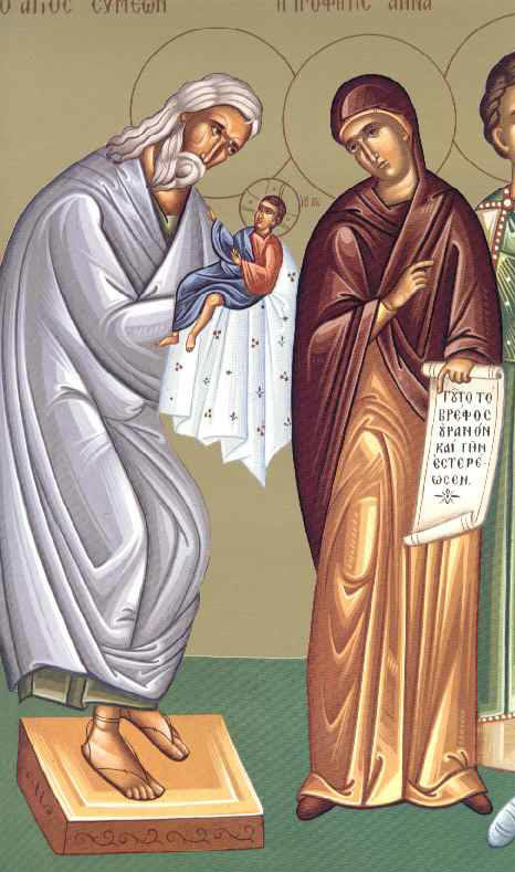 Η Παναγία με τον μνηστήρα της τον άγιο Ιωσήφ, φέρνουν το Χριστό στο ναό. Αναφέρεται ότι ο άγιος Συμεών ήταν απλός άνθρωπος, δίκαιος και ευλαβής. Δεν αναφέρεται ότι ήταν Αρχιερέας ή Λευίτης. Το δίκαιος σημαίνει ότι ήταν σωστός απέναντι στους ανθρώπους και το ευλαβής ότι ήταν εντάξει απέναντι στο Θεό. Τηρούσε δηλαδή τις δύο μεγάλες εντολές. Με μόνο μία από αυτές τις αρετές δεν σώζετε κανένας.