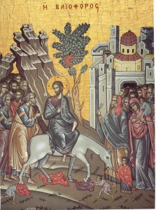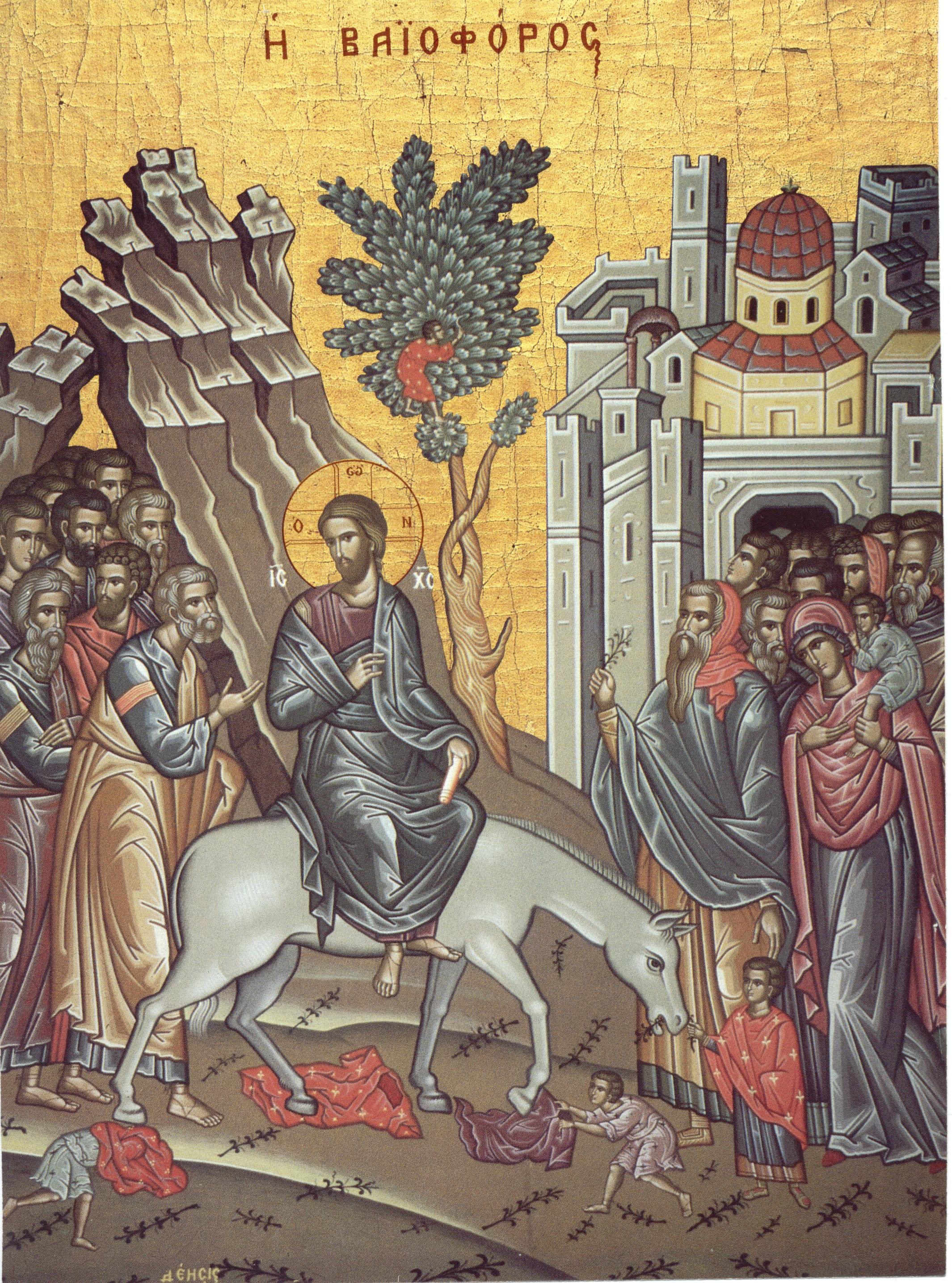 Άκουσε τι μας λέει ο ιεροκήρυκας Ευαγγελιστής της εορτής. Όταν πλησίαζε ο Κυριος στη Βηθφαγή και στη Βηθανία, κοντα στο βουνό που λέγεται των Ελαιών, έστειλε δύο από τούς μαθητάς Του παραγγέλλοντάς τους: «Πηγαίνετε στο απέναντι χωριό και καθώς μπαίνετε θα βρήτε γαϊδουράκι δεμένο. Λυστε το και φέρτε το εδώ». Έκαμαν οι Μαθηταί όπως τούς παράγγειλε ο Ιησούς. Έστρωσαν τα ρούχα τους στο γαϊδουράκι και καβαλλίκεψε ο Ιησούς. Και όταν έφτασε στούς πρόποδες του βουνού, ο κόσμος που είχε συναχτή για την εορτή, πήραν κλαδιά φοινίκων και βγήκαν να υποδεχθούν τον Ιησού. Και όσοι πήγαιναν μπροστά και όσοι ακολουθούσαν φώναζαν: «Ωσαννά στο γιο του Δαυϊδ, ευλογημένος Αυτός που έρχεται στ᾽ όνομα του Κυρίου».