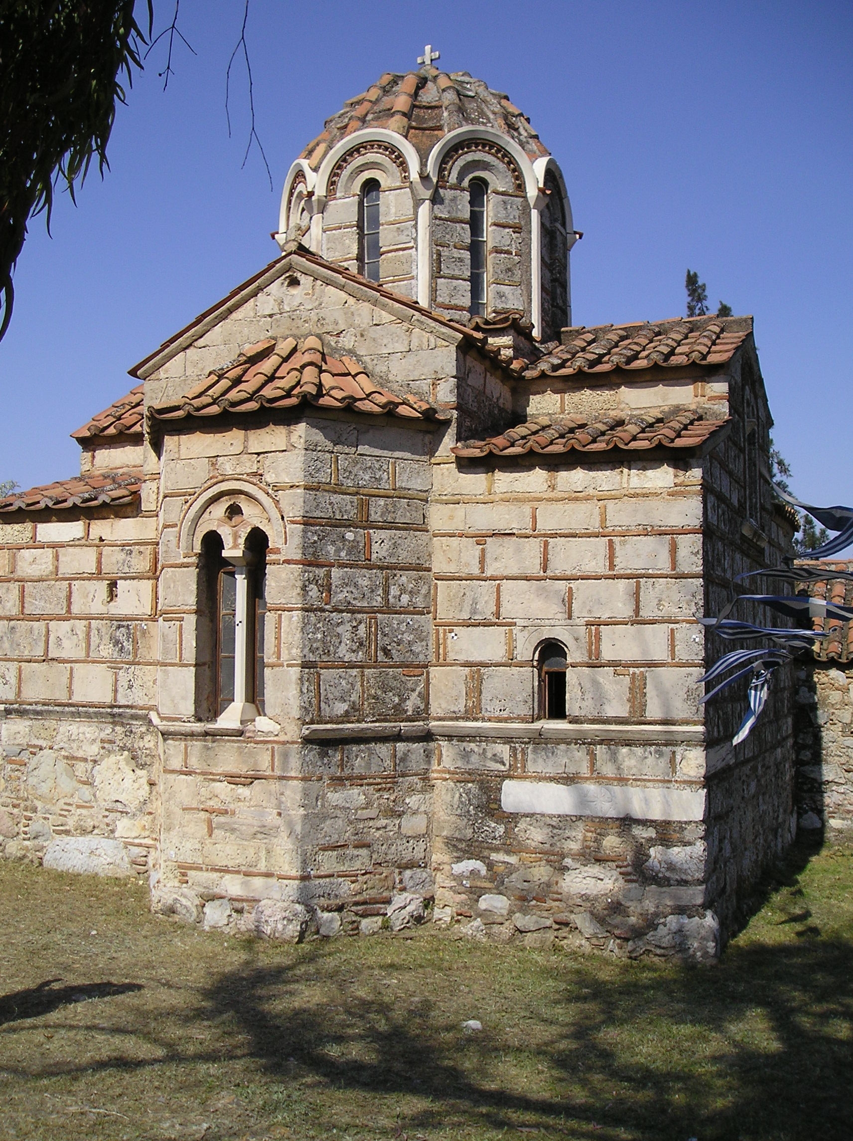 Πρόκειται για έναν δίστηλο σταυροειδή εγγεγραμμένο ναό με παρεκκλήσιο (13ου ή 14ou αι.) στη νότια πλευρά και νάρθηκα (15ου ή 16ου αι.) στη δυτική. Στην ανατολική όψη του προβάλλουν δύο αψίδες των Ιερών του κυρίως ναού και του παρεκκλησίου. Ο τρούλος είναι ‘αθηναϊκός’, δηλαδή το τύμπανο του είναι ιδιαίτερα υψηλό σε σχέση με τη διάμετρο του και εξωτερικά φέρει κιονίσκους στις ακμές του οκταπλεύρου που σχηματίζεται. Η τοιχοδομία στο παλαιότερο τμήμα του είναι ισοδομική με πλινθοπερίκλειστο σύστημα, ιδιαίτερα φροντισμένη έτσι ώστε ο κάθε οικοδομικός λίθος, ίσος περίπου σε μέγεθος με τους άλλους, να περιβάλλεται από σειρά πλίνθων (τούβλων) δημιουργώντας διχρωμία.