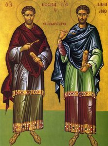 »Στις εννέα προς δέκα Ιανουαρίου, στις τρεις μετά τα μεσάνυχτα, ενώ με είχε πάρει για λίγο ο ύπνος, ξύπνησα και είδα όλο τον θάλαμο φωτισμένο άπλετα με ένα λευκό φως που δεν μπορώ να το περιγράψω. Γύρισα προς την πόρτα και αντί να δω κάποια νοσηλεύτρια, βλέπω δυό άνδρες με γαλάζια άμφια, με μορφή γαλήνια, την οποία γαλήνη μετάδωσαν και σε μένα πριν ακόμη τους μιλήσω. Όταν πλησίασαν κοντά μου τους ρώτησα ποιοί είναι και με πραεία φωνή μου είπαν: “Ο Κοσμάς και ο Δαμιανός είμαστε, Στυλιανέ, γιατροί είμαστε”.