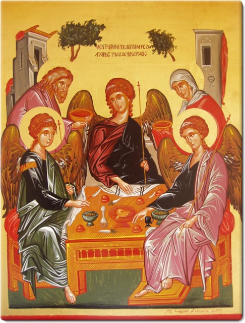 Έτσι μια μέρα τον επισκέφτηκαν τρεις παράξενοι άνθρωποι που έμοιαζαν με αγγέλους. Η Εκκλησία μας λέει πως ήταν η ίδια η Αγία Τριάδα. Ο Πατέρας, ο Υιός και το Άγιο Πνεύμα. Ο Τριαδικός Θεός. Και πράγματι οι τρεις άγγελοι μιλούσαν σαν να ήταν ένας, ο μοναδικός Κύριος, ο Θεός. Ο Αβραάμ τους περιποιήθηκε πλούσια.