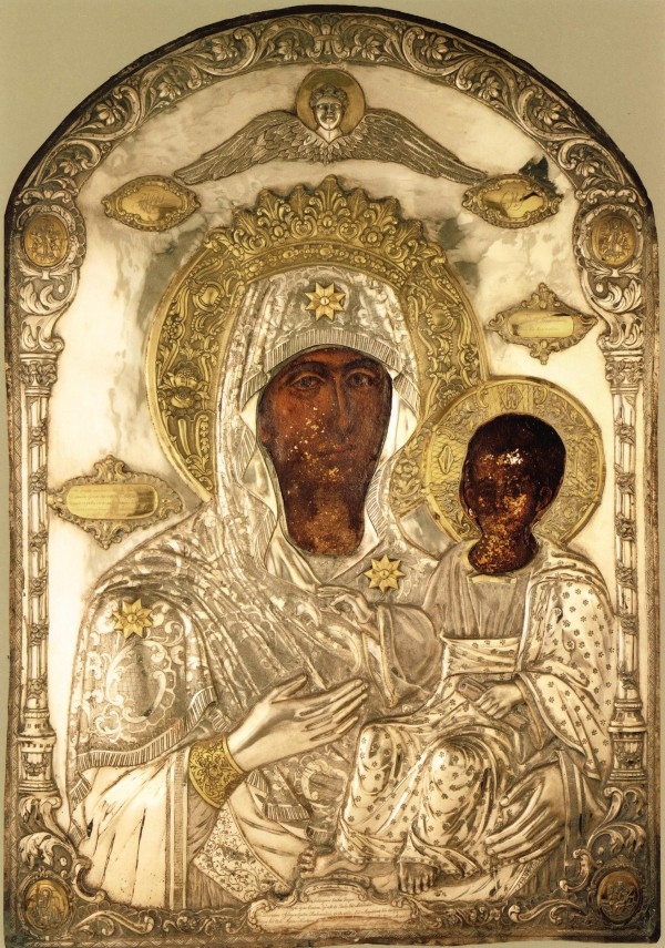 Για την εικόνα αυτή διηγούνται ότι πληγώθηκε από το μαχαίρι ενός δύστροπου ιεροδιάκονου και εκκλησιάρχη (επιμελητή της εκκλησίας, νεωκόρου), ο οποίος, εξαιτίας δήθεν του διακονήματος του, έφθανε πάντοτε καθυστερημένος στην Τράπεζα. Σε μια παρόμοια περίπτωση ο τραπεζάρης (υπεύθυνος της τραπεζαρίας) αγανακτησμένος αρνήθηκε να του δώσει φαγητό. Οι ταραγμένοι και οργισμένοι λογισμοί του εκκλησιάρχη στράφηκαν εναντίον της Θεοτόκου, που ενώ αυτός την υπηρετούσε, αυτή δε μεριμνούσε ούτε για την τροφή του. Από την πληγή αυτή ξεπετάχθηκε αίμα, το πρόσωπο της Παναγίας χλώμιασε, ενώ ο ιεροδιάκονος τυφλώθηκε και έπεσε κάτω φρενόληπτος από τον έλεγχο της συνείδησης, μένοντας στην κατάσταση αυτή τρία χρόνια.