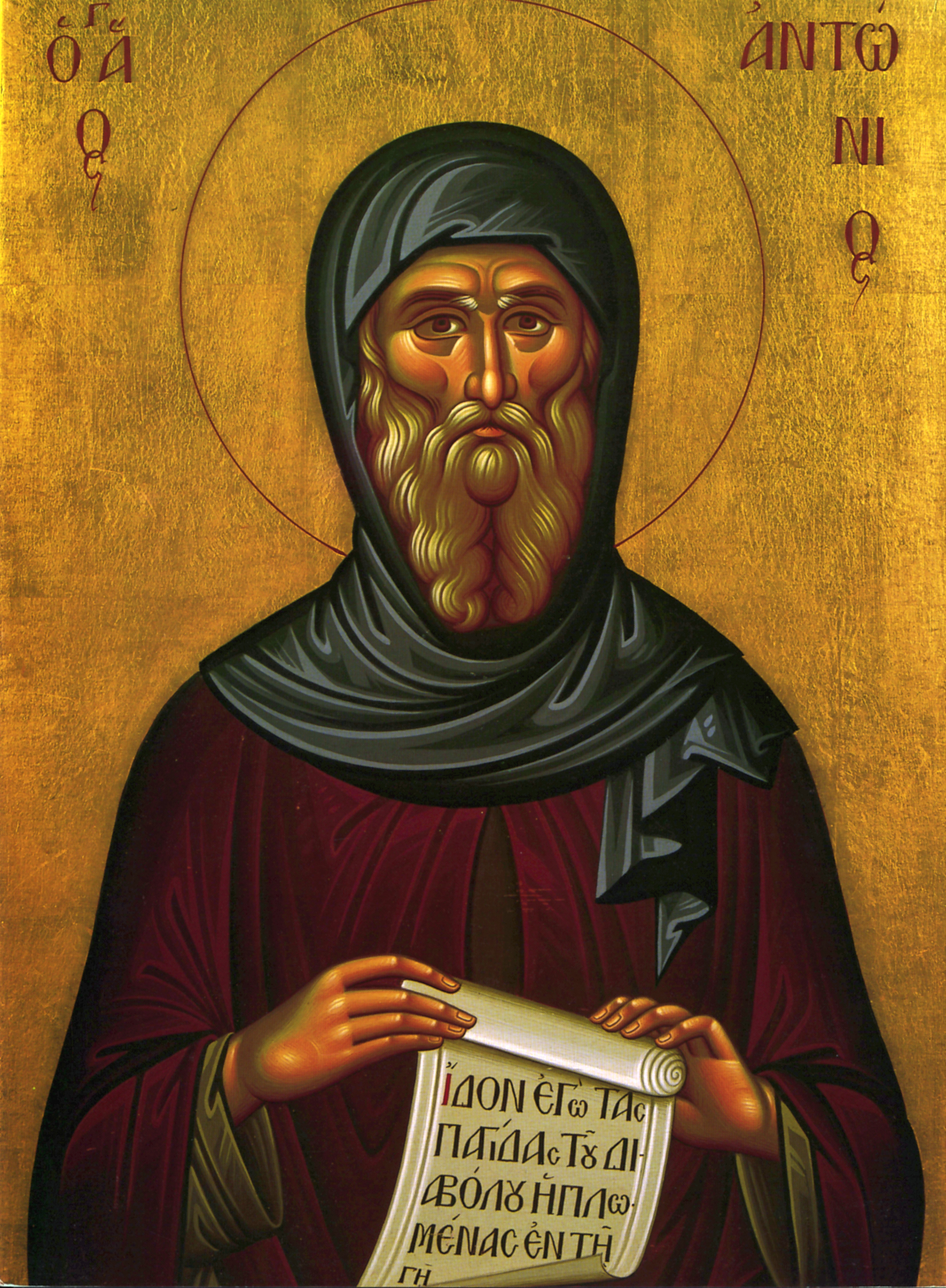Ο Μέγας Αντώνιος γεννήθηκε στην Αίγυπτο από γονείς Χριστιανούς. Γράμματα δεν έμαθε, αυτό όμως δεν τον εμπόδισε ν’ αποκτήση την «έσω σοφίαν», η οποία τον έκανε γνωστό σε όλο τον κόσμο, ώστε η Εκκλησία μας να τον