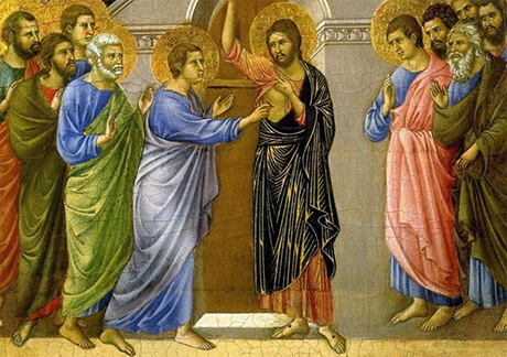 γ) Κι ἐνῶ οἱ μαθητὲς τὸ ἑσπέρας τῆς Κυριακῆς ἦταν συναγμένοι στὸ ὑπερῶο «διὰ τὸν φόβον τῶν Ἰουδαίων», καὶ παρότι οἱ πόρτες ἦταν κλειστές, παρουσιάστηκε ὁ Κύριος καὶ τοὺς λέγει: «Ἡ εἰρήνη νὰ εἶναι μαζί σας». Ταυτόχρονα τούς ἔδειξε τὰ χέρια καὶ τὴν πλευρά του. Οἱ μαθητὲς χάρηκαν ποὺ εἶδαν τὸν Κύριο. Στὴ συνέχεια φὺσηξε στὰ πρόσωπά τους λέγοντας: «Λάβετε Πνεῦμα ἅγιον, ἐὰν συγχωρήσετε τὶς ἁμαρτίες κάποιου τοῦ εἶναι συγχωρημένες• ἂν δὲν τὶς συγχωρήσετε, θὰ μείνουν ἀσυγχώρητες». Ὁ Θωμᾶς δὲν ἦταν μαζί τους ὅταν ἦλθε ὁ Ἰησοῦς. Τοῦ εἶπαν οἱ ἄλλοι μαθητές: «Εἴδαμε τὸν Κύριο». Ἐκεῖνος ἀπαντᾶ: «Ἐὰν δὲν δῶ στὰ χέρια του τὸ σημάδι ἀπὸ τὰ καρφιὰ καὶ δὲν βάλω τὸ δάκτυλό μου σὲ αὐτὰ καὶ δὲν βάλω τὸ χέρι μου στὴν πλευρά του, δὲν θὰ πιστέψω».