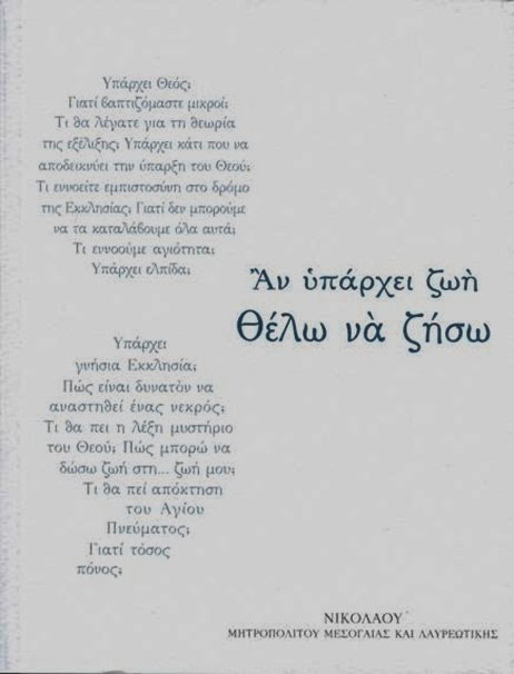 Από το βιβλίο: Αν υπάρχει ζωή, θέλω να ζήσω. 100 ερωτήσεις και απαντήσεις περί πίστεως. Νικολάου, Μητροπολίτου Μεσογαίας και Λαυρεωτικής. Νοέμβριος 2013.