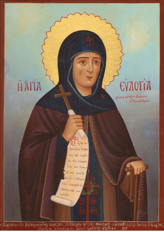 Μεταξύ των αγίων αυτών μητέρων εξέχουσα θέση έχει η Οσία Ευλογία, η μητέρα του Αββά Θεοδοσίου, του Κοινοβιάρχου. Αυτή υπήρξε σύζυγος του σεμνού Προαιρεσίου και διέπρεψε στην αρετή, στην καθαρή πολιτεία και στην ασκητική της αγωγή. Ήταν ένα ευωδιαστό λουλούδι που φύτρωσε στη Μωγαρισσό της αγιοτόκου Καππαδοκίας, με τις υπόσκαπτες πόλεις, Ναούς και Μοναστήρια, της χώρας των Μεγάλων Πατέρων και Οσίων της Εκκλησίας μας. Η ευωδία της ήταν «Χριστού ευωδία» (Β Κορ. β 15), που δεν περιοριζόταν μόνο στον εαυτό της, αλλά διαχεόταν σε όλο της το περιβάλλον και φυσικά και στον γιο της, τον μετέπειτα Όσιο Θεοδόσιο. Από την ευωδία αυτή των αρετών της ο μικρός Θεοδόσιος ευφραινόταν καθημερινά και η δυσωδία της ματαιότητος των γηΐνων απομακρυνόταν από τη ζωή του, μέχρι που τον κέρδισε το άρωμα της μοναδικής πολιτείας, το άρωμα της ερήμου.