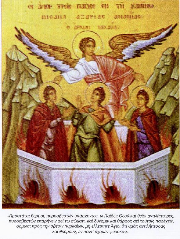 Δεν σεβασθήκατε το χειροποίητο άγαλμα του ανθρώπου – βασιλέως, αλλά θωρακισθήκατε με την απερίγραπτη Ενέργεια του Θεού, οπότε, δοξασθήκατε στο «αγωνιστικό» σκάμμα του πυρός της καμίνου, τρισμακάριοι παίδες! Σταθήκατε στην ανυπόστατη φωτιά, και με ύμνους καλέσατε σε βοήθεια τον Θεό λέγοντας: Τρέξε γρήγορα οικτίρμων, και σπεύσε ελεήμων να μας βοηθήσεις, γιατί όταν θέλεις, όλα τα μπορείς.