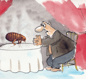 Ο άνθρωπός μας άνοιξε τα μάτια του πολύ καλά κάτω από τα χοντρά γυαλιά του και παρατηρούσε μέσα στην παλάμη του τον ψύλλο που τρεμουλιαστά σιγομουρμούριζε, νομίζοντας πως θα κερδίσει τη συμπάθεια του.
