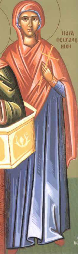 Η Θεσσαλονίκη ήταν κόρη ενός Ιερέα των ειδώλων, πού ονομαζόταν Κλέων και ήταν αρκετά πλούσιος. Όταν έμαθε ότι η κόρη του έγινε χριστιανή, θερμά την παρακάλεσε να αρνηθεί τον Χριστό, πράγμα που δεν κατόρθωσε. Τότε τη γύμνωσαν και τη μαστίγωσαν με μαστίγια από ωμά δέρματα, τέσσερις άνδρες. Έπειτα έσπασαν τα πλευρά της και αφού πήραν την περιουσία της την εξόρισαν, όπου ομολογώντας τον Χριστό απεβίωσε.