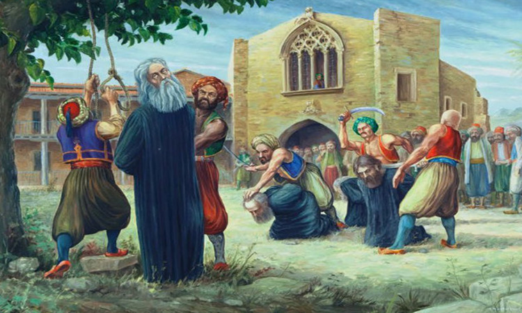 […..]Ο Αρχιεπίσκοπος Κυπριανός οδηγήθηκε τελευταίος στο μαρτύριο και κατά την υπόσχεση του Κιουτσούκ δεν αποκεφαλίστηκε, αλλά κρεμάστηκε από μία συκαμινιά της πλατείας του Σεραγιού.
