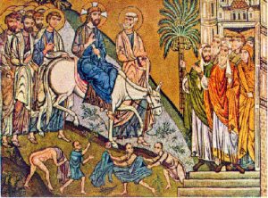 Η σκηνή αναφέρεται στην Ευαγγελική περικοπή που περιγράφει τη θριαμβευτική είσοδο του Χριστού στα Ιεροσόλυμα, έξι ημέρες πριν από το Πάσχα. Για τα περιστατικά αυτά μιλούν όλοι οι Ευαγγελιστές: Ματθ. 21: 1-11, Μαρκ. 11:1-10, Λουκ. 19: 29-38, Ιωάν. 12:12-15.