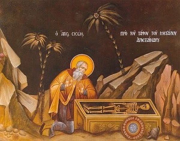Ο Όσιος Σισώης επεσκέφθη κάποτε τον τάφο του Μεγάλου Αλεξάνδρου. Όταν στάθηκε μπροστὰ και αναλογίσθηκε το μεγαλείο, στο οποίο έζησε ο ενδοξώτατος αυτὸς βασιλιὰς των Ελλήνων, την δόξα που απέκτησε με τα κατορθώματά του στους πολέμους, που τον έκαμαν ήρωα και κατακτητὴ της εποχής εκείνης, έφριξε με την σκέψη πόσο άστατη είναι η ζωὴ και πόσο πρόσκαιρη η δόξα της. Έκλαψε και θρήνησε για τη ματαιότητα όλης αυτής μιάς προσπάθειας που κατέλαβε όλη του την ζωή και που δεν του προσέφερε κανένα καλὸ στην ψυχή του.