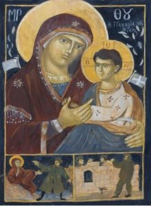 Η εικόνα παρίστανε την Παναγία με το Χριστό και στο κάτω μέρος τα θαύματά της. Αριστερά τον ανθυπασπιστή που πάει να πυροβολήσει την Παναγία και δεξιά τους στρατιώτες που πάνε να χτίσουν το μύλο για να τον κάνουνε εκκλησία.