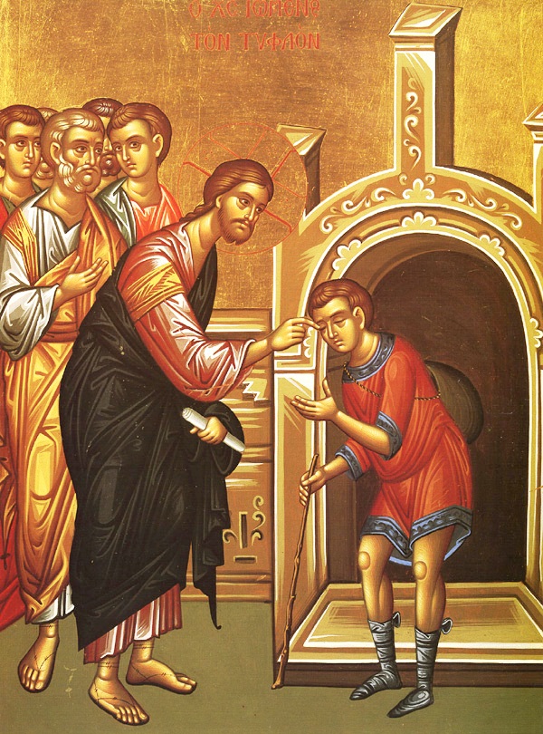 Ο Χριστός θεραπεύει κάποιον εκ γενετής τυφλό. Οι Φαρισαίοι όμως εγείρουν θέμα: Η θεραπεία έχει γίνει ημέρα Σάββατο, πράγμα κατ’ αυτούς ανεπίτρεπτο, λόγω της ισχύουσας αργίας του Σαββάτου. Ως εντριβείς γνώστες του μωσαϊκού νόμου, θεωρούν ότι ο Χριστός είναι παραβάτης του νόμου, άνθρωπος αμαρτωλός και, συνεπώς, αποκλείεται να είναι απεσταλμένος του Θεού. Ο πρώην τυφλός όμως παρακάμπτει τα λογικοφανή τους επιχειρήματα. Αντιπαραθέτει μόνο την αναντίρρητη εμπειρία του, παραπέμποντάς τους στο αυτονόητο: Ο άνθρωπος αυτός μου άνοιξε τα μάτια. Αν δεν ήταν «εκ Θεού, ουκ ηδύνατο ποιείν ουδέν». Δεν θα μπορούσε να κάνει τίποτε από αυτά. Ο Θεός ακούει αυτόν που είναι «θεοσεβής και το θέλημα αυτού ποιεί» (Κυριακή του Τυφλού).