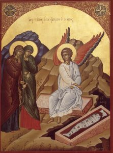 Ἔπειτα τὸ σημερινὸ Εὐαγγέλιο μᾶς ὁμιλεῖ γιὰ τὴν τολμηρὴ πράξη τῶν τριῶν μυροφόρων γυναικῶν. Εἶναι κι αὐτὴ μία πράξη, ποὺ τὴν ἐμπνέει ἡ ἀγάπη κι ἡ ἀφοσίωση στὸ πρόσωπο τοῦ Ἰησοῦ Χριστοῦ. Πολλὲς δυσκολίες εἴχανε νὰ ὑπερνικήσουν οἱ τρεῖς γυναῖκες· τοὺς ἄρχοντες, τὸ λαό, τὴ στρατιωτικὴ φρουρὰ καὶ τὴν πέτρα τοῦ μνημείου. Δὲν λογάριασαν τίποτε ἀπ’ ὅλα αὐτὰ καὶ μόνο τὴ τελευταία στιγμὴ θυμήθηκαν τὴν πέτρα. Ποιὸς θὰ τραβοῦσε τὴ μεγάλη πέτρα ἀπὸ τὴ θύρα τοῦ μνημείου; Μὰ ἡ πέτρα βρέθηκε τραβηγμένη καὶ Ἄγγελος Κυρίου καθότανε στὰ δεξιὰ μέσα στὸ μνημεῖο. Αὐτὸς ἀνάγγειλε στὶς μυροφόρες γυναῖκες τὴν Ἀνάσταση.