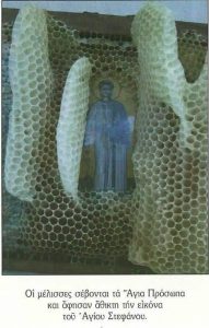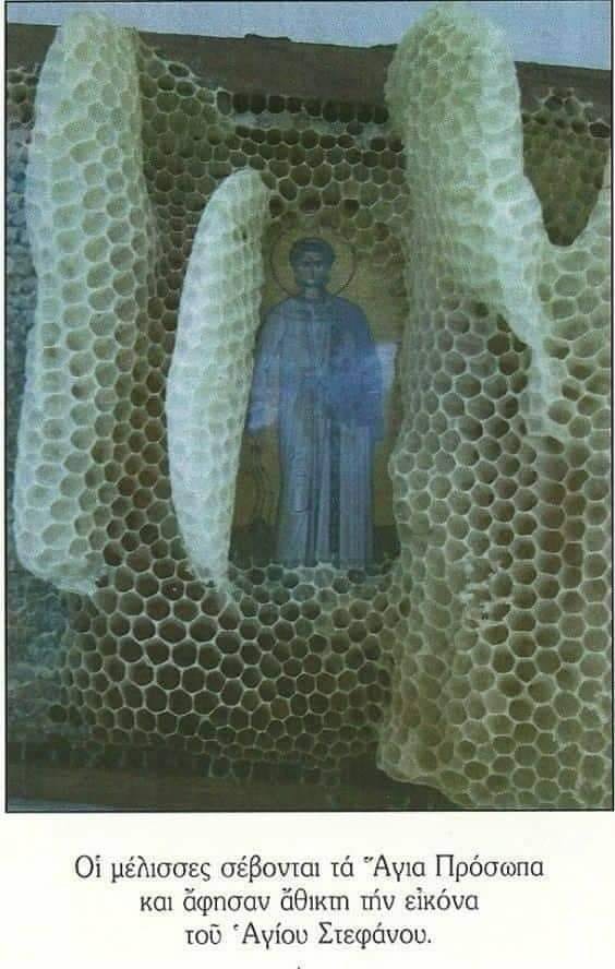 Τελευταίως, του πήγαμε κι εμείς μία εικόνα του Αγίου Πρωτομάρτυρος και Αρχιδιακόνου Στεφάνου, το όνομα του οποίου φέρουν οι ταπεινές μας εκδόσεις. Όπως θα διαπιστώσετε και από την φωτογραφία που δημοσιεύουμε, οι μέλισσες, ενώ έχουν στολίσει με κερί όλη την εικόνα, έχουν αφήσει ακάλυπτο το πρόσωπο και το σώμα του Αγίου μας.
