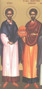 Οι άγιοι ανάργυροι Κύρος και Ιωάννης ανήκουν στη χορεία των γιατρών αγίων της εκκλησίας, οι οποίοι, επειδή δωρεάν πρόσφεραν τις υπηρεσίες των, γι’ αυτό και ονομάζονται ανάργυροι. Ο Κύρος ήταν από την Αλεξάνδρεια και ο Ιωάννης από την Έδεσσα της Μεσοποταμίας. Μαρτύρησαν κι οι δυο το 292, στα χρόνια δηλαδή του Διοκλητιανού. Μια χριστιανή γυναίκα τότε, η Αθανασία, με τις τρεις θυγατέρες της, Θεοδότη, Θεοκτίστη και ευδοκία, κατηγορήθηκαν ως χριστιανές και οδηγήθηκαν στον κριτή. Ο Κύρος και ο Ιωάννης φοβήθηκαν μήπως οι γυναίκες δειλιάσουν κι αρνηθούν την πίστη τους. Παρουσιάσθηκαν λοιπόν για να τις ενθαρρύνουν. Το αποτέλεσμα ήταν ότι αποκεφαλίσθηκαν όλοι.