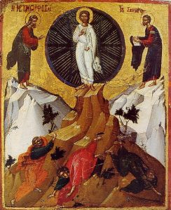 ΚΑΙ μεθ’ ημέρας έξ, παραλαμβάνει ο Ιησούς τον Πέτρον και Ιάκωβον και Ιωάννην τον αδελφόν αυτού και αναφέρει αυτούς εις όρος υψηλόν κατ’ ιδίαν, και μετεμορφώθη έμπροσθεν αυτών, και έλαμψε το πρόσωπον αυτού ως ο ήλιος, τα δέ ιμάτια αυτού εγένετο λευκά ως το φώς. Και ιδού ώφθησαν αυτοίς Μωσής και Ηλίας μετ’ αυτού συλλαλούντες. Αποκριθείς δέ ο Πέτρος είπε τω Ιησού: Κύριε, καλόν εστιν ημάς ώδε είναι. Ει θέλεις, ποιήσωμεν ώδε τρείς σκηνάς, σοί μίαν και Μωσεί μίαν και μίαν Ηλία. Έτι αυτού λαλούντος, ιδού νεφέλη φωτεινή επεσκίασεν αυτούς, και ιδού φωνή εκ της νεφέλης λέγουσα: «ούτός εστιν ο υιός μου ο αγαπητός, εν ώ ευδόκησα, αυτού ακούετε». Και ακούσαντες οι μαθηταί έπεσον επι πρόσωπον αυτών και εφοβήθησαν σφόδρα. Και προσελθών ο Ιησούς ήψατο αυτών και είπεν: εγέρθητε και μή φοβείσθε. Επάραντες δέ τους οφθαλμούς αυτών, ουδένα είδον ει μή τον Ιησούν μόνον. Και καταβαινόντων αυτών απο του όρους ενετείλατο αυτοίς ο Ιησούς λέγων: «μηδενί είπητε το όραμα, έως ού ο υιός του ανθρώπου εκ νεκρών αναστή».