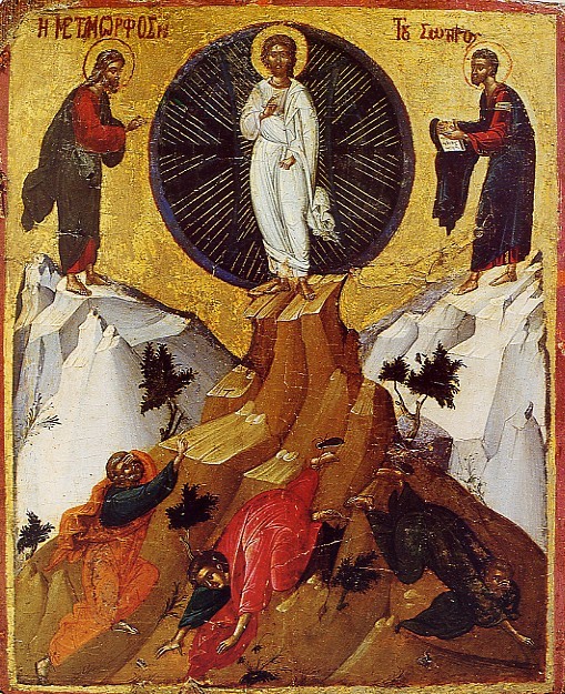 Ύστερα από έξι μέρες, παίρνει ο Ιησούς μαζί του τον Πέτρο, τον Ιάκωβο και τον Ιωάννη, τον αδερφό του, και τους ανεβάζει σ’ ένα ψηλό βουνό. Εκεί μεταμορφώθηκε μπροστά τους• έλαμψε το πρόσωπό του σαν τον ήλιο και τα ενδύματά του έγιναν άσπρα σαν το φως. Τότε εμφανίστηκε σ’ αυτούς ο Μωυσής και ο Ηλίας, και συνομιλούσαν με τον Ιησού. «Κύριε, είναι ωραία να μείνουμε εδώ!» είπε ο Πέτρος στον Ιησού. «Να κάνουμε, αν θέλεις, εδώ τρεις σκηνές: μια για σένα, μια για το Μωυσή και μια για τον Ηλία». Ενώ μιλούσε ακόμα, ένα φωτεινό σύννεφο τους σκέπασε, και μέσα από το σύννεφο ακούστηκε μια φωνή που έλεγε: «Αυτός είναι ο αγαπημένος μου Υιός, ο εκλεκτός μου• αυτόν να ακούτε». Όταν το άκουσαν οι μαθητές, έπεσαν με το πρόσωπο στη γη και φοβήθηκαν πολύ. Τους πλησίασε τότε ο Ιησούς, τους άγγιξε και τους είπε: «Σηκωθείτε και μη φοβόσαστε». Σήκωσαν τότε τα μάτια τους και δεν είδαν κανέναν άλ¬λο, παρά τον ίδιο τον Ιησού μόνο του.